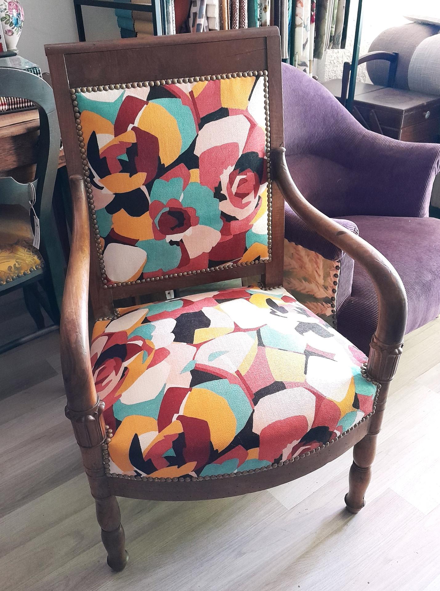 Paire de fauteuils tonneau refaits avec le même tissu mais l'un est sur l'endroit l'autre est sur l'envers. Très original